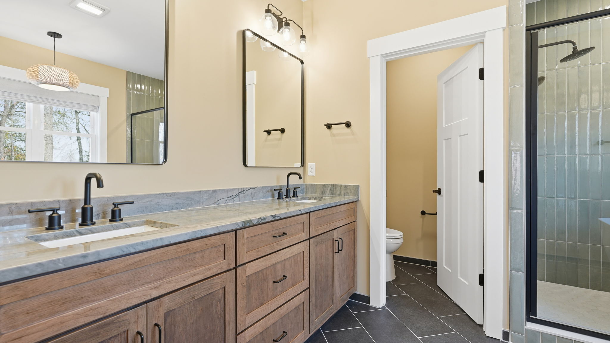 - Craft and Character: Clean exterior lines are paired with rich natural textures. A charcoal toned shingled roof, and deep overhangs reflect the family’s love of the outdoors. Inside, shaker style cabinetry, honed quartz, and engineered hardwoods ground the home in quiet quality.